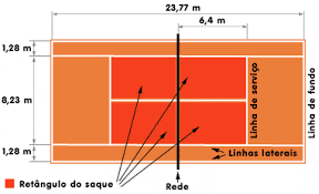 A quadra deve ser um retângulo de 23,77 m de comprimento por 8,23 m de largura, para os jogos de simples. Para os jogos de duplas e quadra deve medir 10,97m de largura.